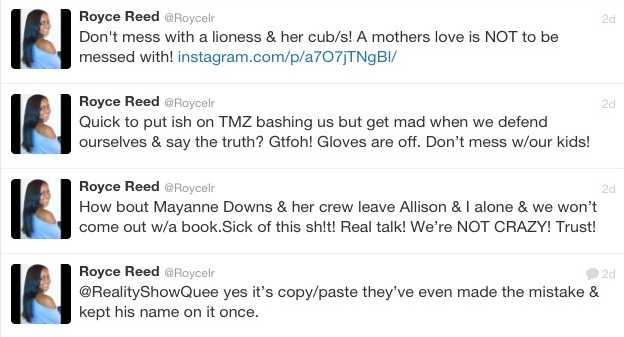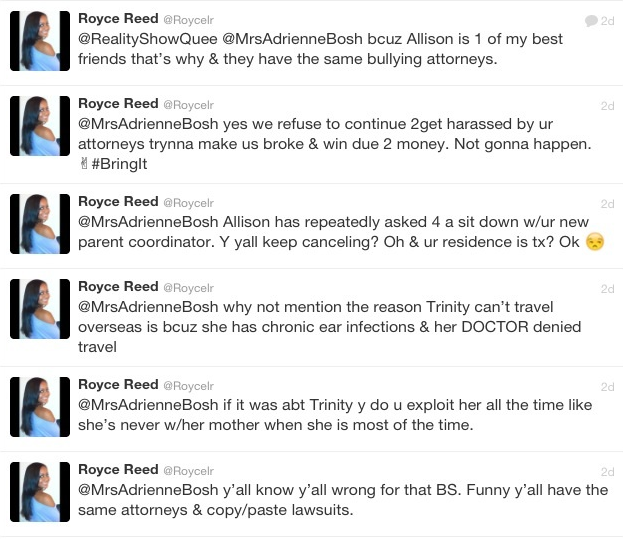 Ex Basketball Wives reality star Royce Reed is not afraid to speak on her mind on twitter, even when she’s defending a friend. This week, she nearly lit into Christopher Bosh’s wife, Adrienne, on behalf of one of her girlfriends. Not just any girlfriend, but Allison Mathis, the mother of one of Chris’ children. Here’s why: For the past few years, Chris has been in a bitter legal battle with his ex, Allison, to gain custody of their 4-year-old daughter, Trinity. According to TMZ, Chris filed legal docs asking a judge to strip Allison primary physical custody of Trinity. What’s his rationale? He says that Allison has been trying to alienate their child, blocking contact, refusing to let them travel together, and poisoning their daughter against him. And with that said, he wants primary physical custody, but says he’s more than willing to give Allison her fair share of mother-daughter time in the form of visitation. Allison has replied with her own legal documents, discounting Chris’ claims. Meanwhile, this must have REALLY ticked Royce off. This week, she tweeted Adrienne directly about this entire fiasco. Peep what she had to say about this situation.