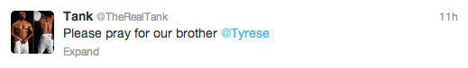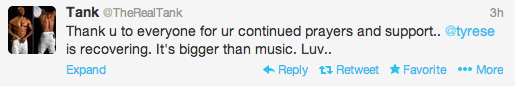 Thank u to everyone for ur continued prayers and support .. Tyrese is recovering. It’s bigger than music. Luv..