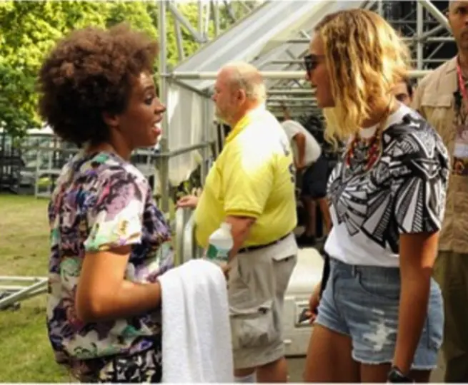 Girl Talk. No Camera’s allowed! Beyonce was spotted chatting with her sister, Solange, after her #MadeInAmerica Festival.