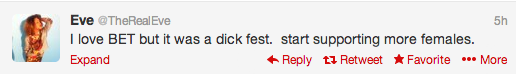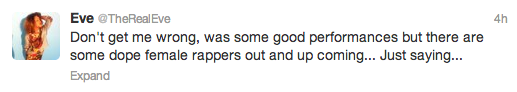 P.S. Eve wants BET to do better, in terms of female representation at the Hip Hop Awards. After the ceremony, she took to her twitter, writing: