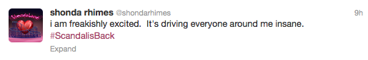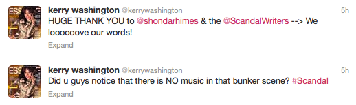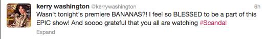 After a three month hiatus, ABC’s ‘Scandal‘ returned with a bang and a ton of buzz. Scandal parties erupted Thursday night across the country, along with an endless amount of social media chatter on platforms like Facebook, Twitter and Instagram. As per usual, the cast and Ms. Rhimes tweeted throughout the episode.