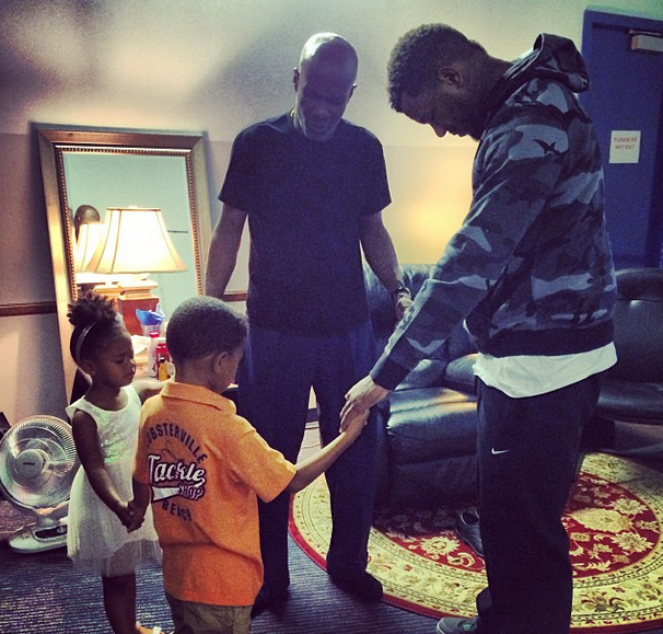 Rapper The Game and his two children pray with Bishop Noel Jones (‘Preachers of LA’) at church.