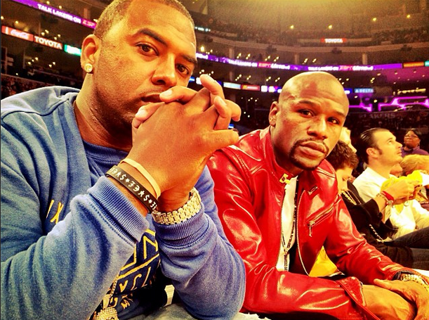 Floyd Mayweather Jr and a friend trip-a-referee at the Lakers vs. Hawks game.