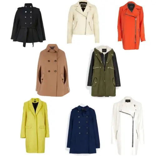 From Left to Right: Izabel London Black Belted Cape $88, River Island White Leather Moto Jacket $190, River Island Orange Biker Coat $135, Warehouse Melton Cape $120, Zara combination parka w/leather detailing $179, TopShop Fluffy Boyfriend Coat $178, Zara Short Crossover Trench Coat $100, River Island White Biker Coat $135.