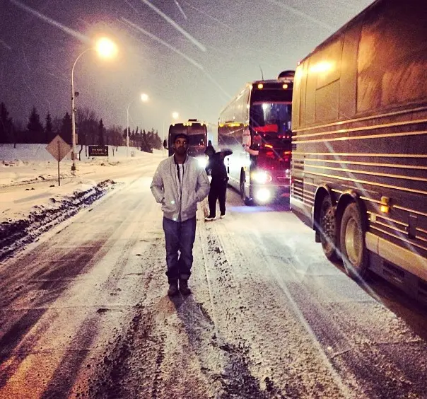 Drake takes a stretch, at a pit stop during his ‘Would You Like A Tour?’. Location? Somewhere Cold, USA.