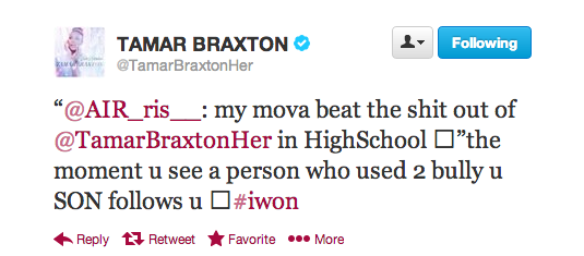 This week, the Love & War singer was reminded of her unpleasant past when she got into a twitter spat with the son of one of her former bullies. The kid (we’re assuming he’s under age) tweeted Tamar: