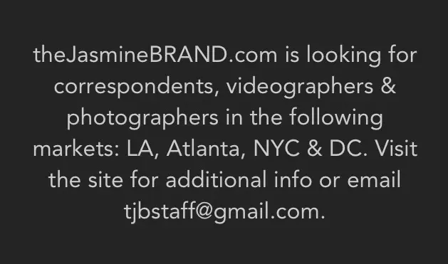 If you’re a budding a) journalist, host or correspondent b) videographer or c) photographer and live in any of the following markets (Los Angeles, District of Columbia, New York City and Atlanta) this opportunity may be for you! theJasmineBrand.com is expanding its team. Check out the descriptions below.