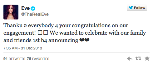 ‘Tis the season for engagements. Rapper Eve (born Eve Johan Jiffers) is engaged to her British beau Maximillion Cooper. According to E! News, Cooper popped the question on Christmas Day as evidenced by the large rock in a photo the 35-year-old Philadelphia native posted on her Instagram page with her mother and younger brother.