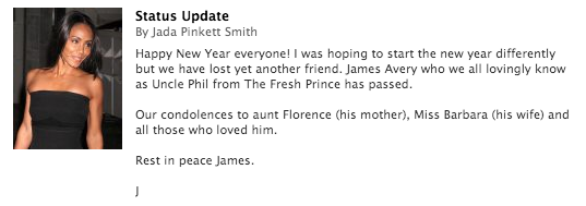 Jada Pinkett Facebook postWhile the After Earth actor may not have spoken out in regards to his TV father’s passing his wife posted on her Facebook her condolences to the family: