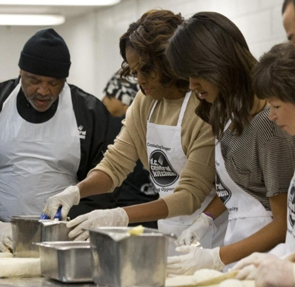 First Lady Michelle Obama keeps and her daughter Malia, give back at DC’s Central Kitchen. The two devoted their entire MLK Day toward service.