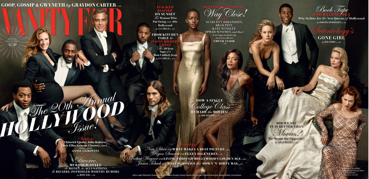 For their 20th, the magazine did a special three-panel spread with a group of both up-and-coming and distinguished actors. Photographed by Annie Leibovitz, the issue features Oscar nominees Julia Roberts (August: Osage County), Chiwetel Ejiofor (12 Years a Slave), Jared Leto (Dallas Buyers Club), and Lupita Nyong’o (12 Years a Slave), as well as Idris Elba (Mandela: Long Walk to Freedom), George Clooney (Gravity), Michael B. Jordan (Fruitvale Station), Naomie Harris (Mandela: Long Walk to Freedom), Brie Larson (Short Term 12), Chadwick Boseman (42), Margot Robbie (The Wolf of Wall Street), and Léa Seydoux (Blue Is the Warmest Color). Click here for the full feature.