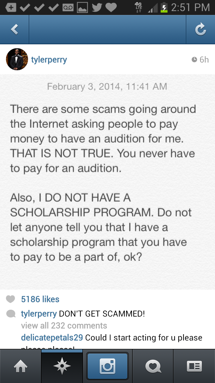 Tyler Perry has been a household name for several years now, with success as a director, playwright, screenwriter and actor. To date, he’s made tons of money in Hollywood, listed as the highest paid man in entertainment by Forbes (in 2011). He has been a staple in the black community yet, has been able to cross the color lines to become one of Hollywood’s “It” directors. Because of this success, there also have been a few bumps in the road. This week, the 44-year-old took to social media to warn fans and budding actors about a new scan that his brand has been associated with. There is currently a scam going around stating that Mr. Perry is auditioning for talent for a new show on Oprah’s OWN network.