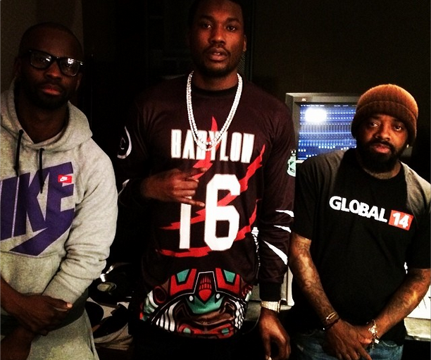 Bryan Michael Cox, Meek Mill and Jermaine Dupri pose in the studio.