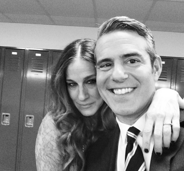 Bravo’s Andy Cohen and Sarah Jessica Parker take a photo backstage before presenting her shoe line in New York City.