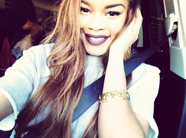 Teyana Taylor smiles brightly, showing off her light locks and dark lips.