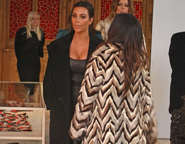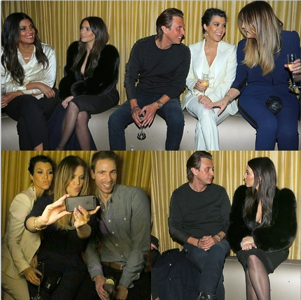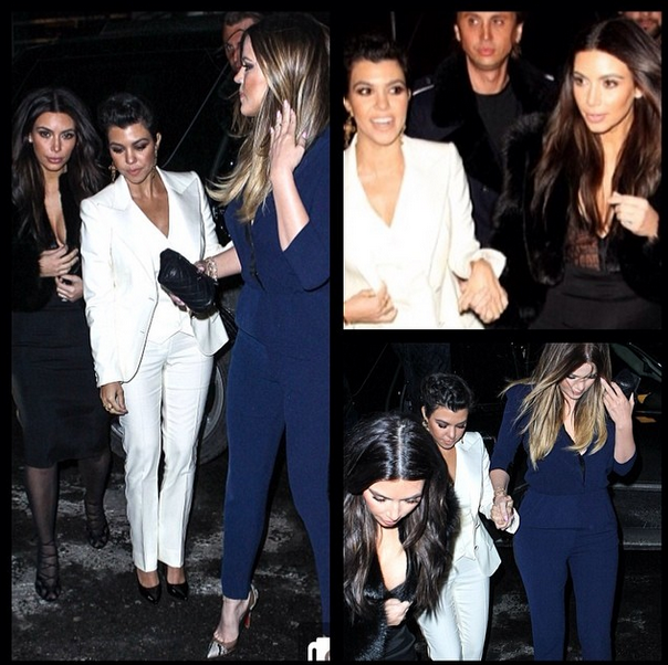 Kim wore a black sheer Stella McCartney top, a Lanvin black skirt, a Tom Ford jacket and Tom Ford heels. Kourtney wore a white pantsuit with black pumps and Khloé rocked blue jumpsuit with snakeskin heels.