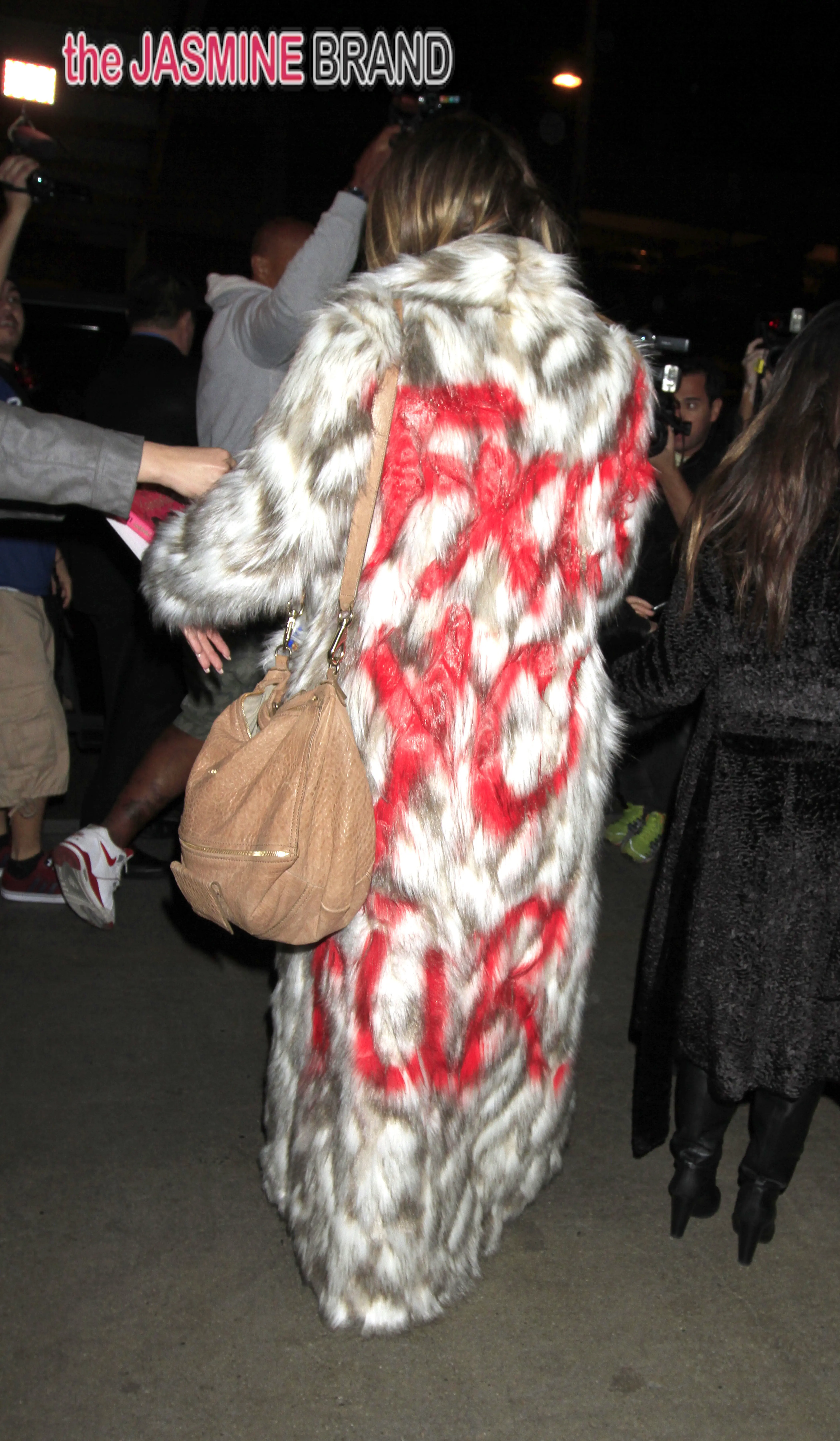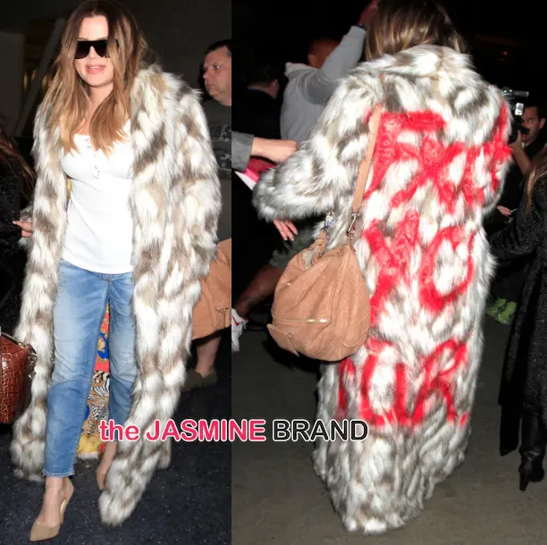 Khloé Kardashian knows how to get her point across. On Monday, the 31-year-old Keeping Up With the Kardashian’s star had tongues wagging when she stepped out donning a floor length faux fur. While lunching at Serafina in NYC’s Meatpacking District, she wore a jacket that had the words