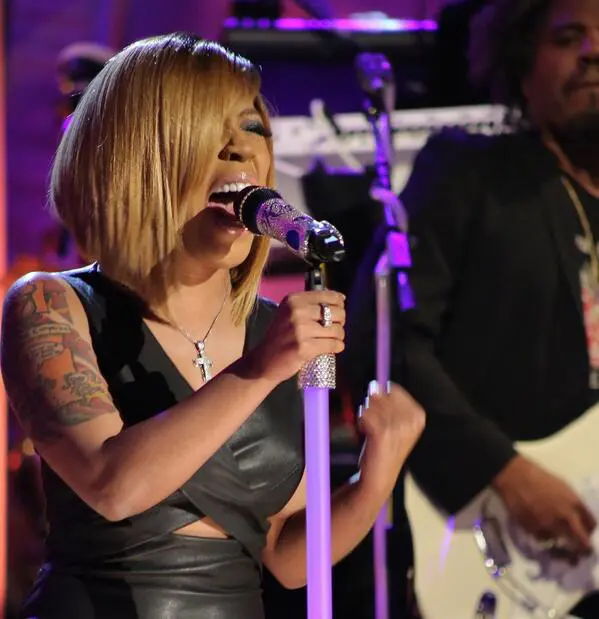Wearing a sleeveless black leather dress and fire engine red Loubitin booties, the Memphis native belted out the soulful song with back-up singers and a live band. Check her performance: