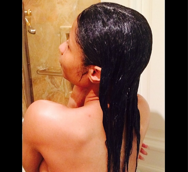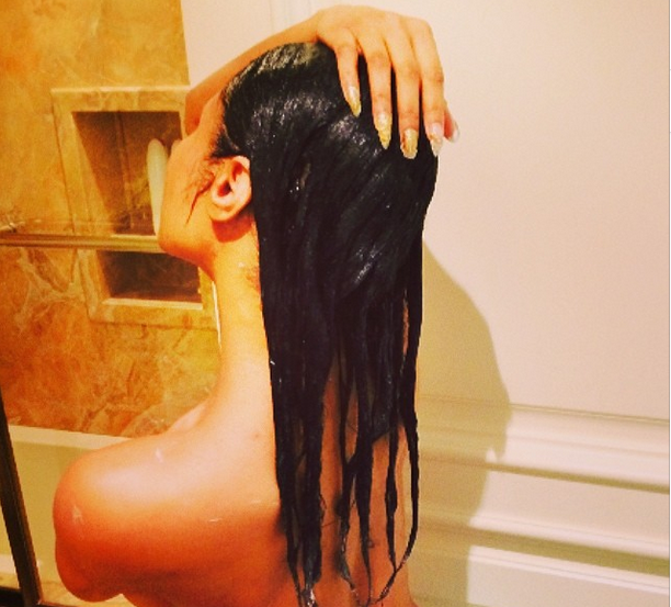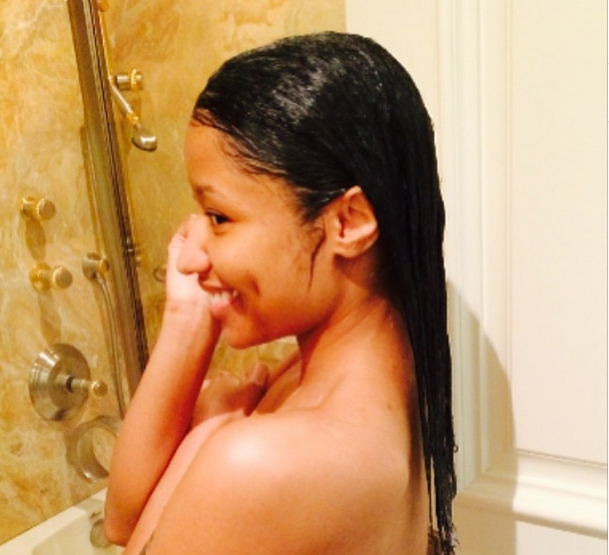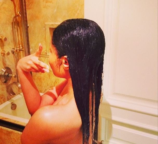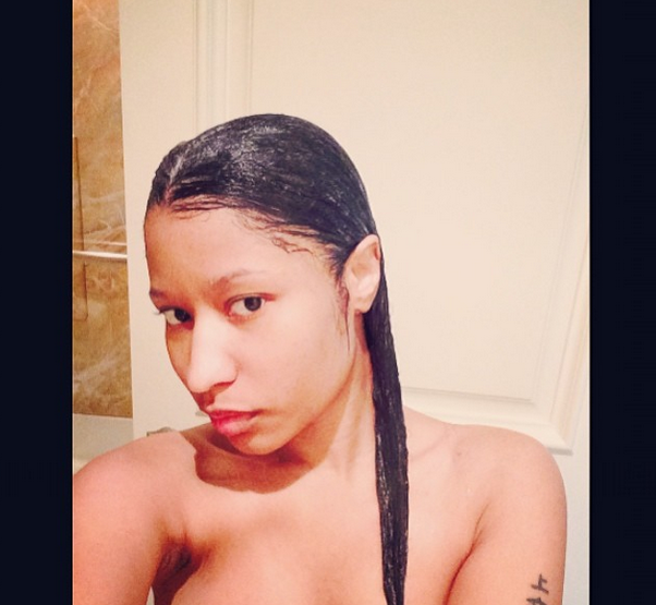 It’s none other than Nicki Minaj (real name Onika Tanya Maraj). While you were fake-busy or enjoying your beautiful lives, the 31-year-old rapper was stripping, literally for Instagram. Covering her bare breasts, she posed from the waist up, with long, wet hair. From the looks of things, she’s in a bathroom of some sort.