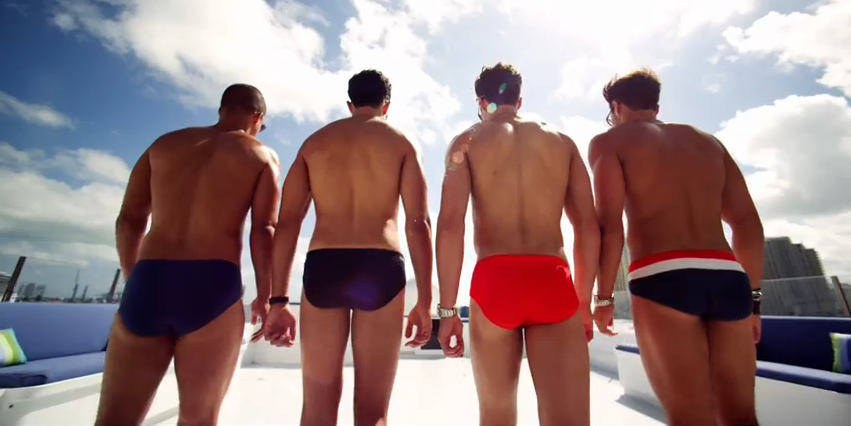 Taking a page from their playbook, the 5 minute visuals feature all types of male eye candy–in swimming pools, pouring bubbles on themselves and haute shower scenes.