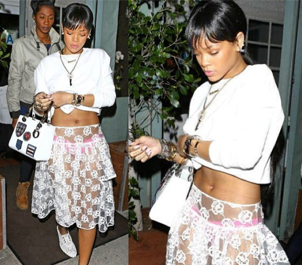 No fashion rules allowed for Rihanna. The 26-year-old singer spent Thursday night dinning at Santa Monica’s Il Ristorante di Giorgio Baldi. Her see-thru top and skirt are from Simone Rocha’s Spring 2014 collection. She paired the ensemble with white oxford shoes and Christian Dior handbag.