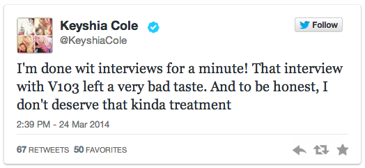 After hopping off the live radio call, Cole took to her Twitter to blast the station and proclaim her hiatus from interviews.