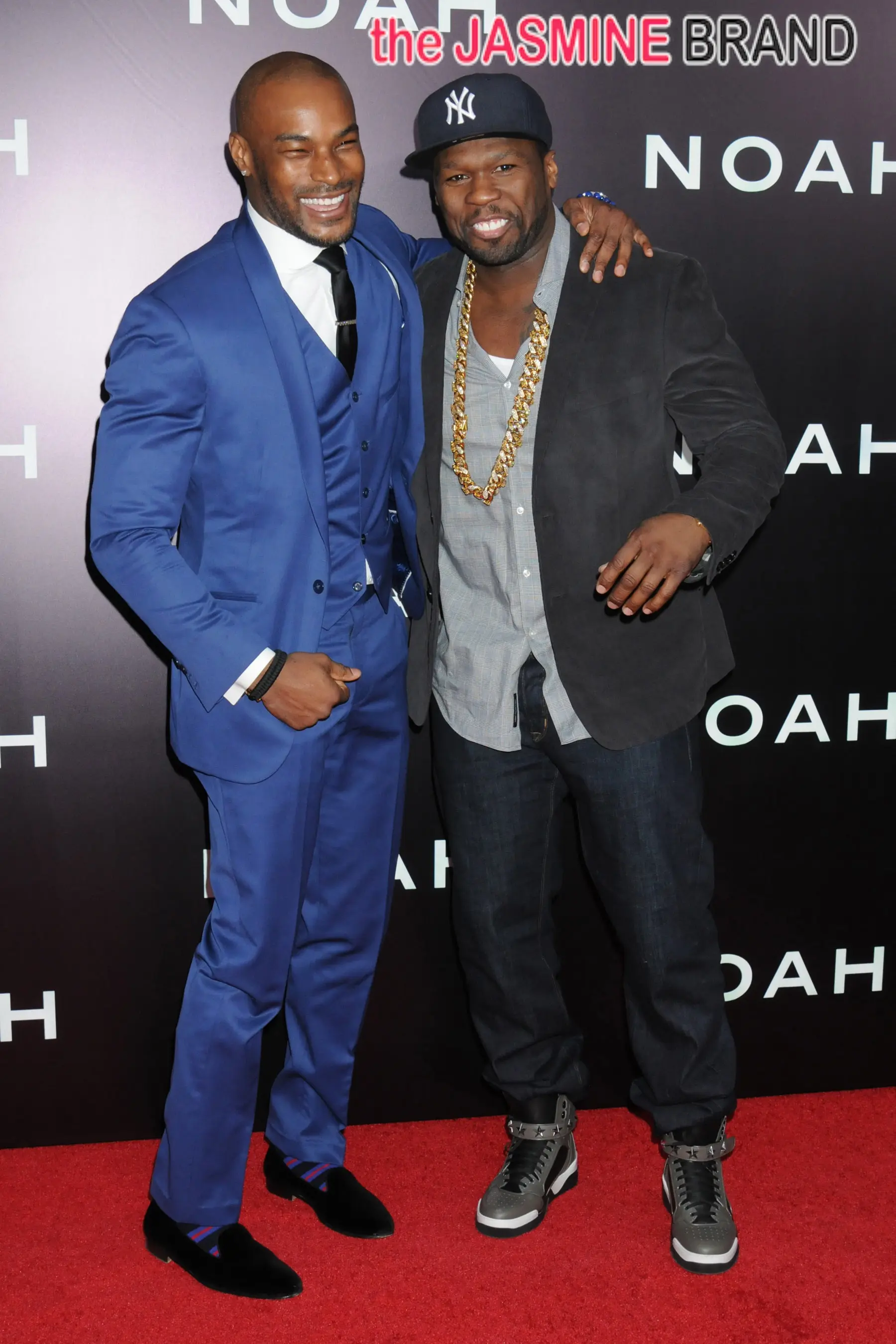 Tyson Beckford and Curtis ’50 Cent’ Jackson laugh on the red carpet of the Noah premiere.