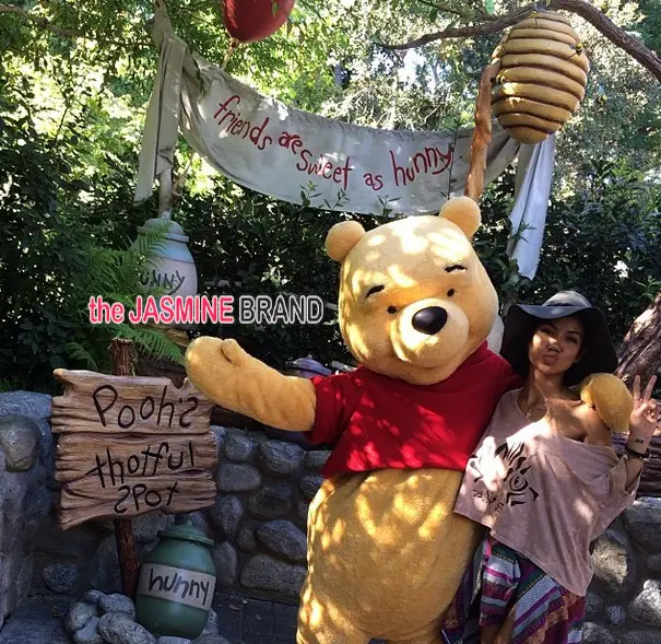 She’s a kid at heart! Jhene Aiko poses with Winnie the Pooh at Disney Land.