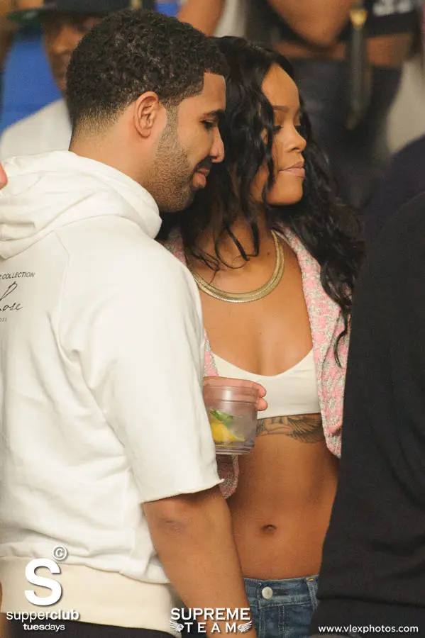 Rumored couple Drake and Rihanna were spotted partying together stateside in downtown LA. Rihanna, clad in a pink Balmain tweed jacket, white bra and embellished jeans, were celebrating bestie Melissa Forde’s birthday at the SupperClub in Hollywood. Ciara’s baby’s daddy, Future and Miley Cyrus’ bff, Mike Will Made It were also in attendance, along with J. Cole, Christina Milian, E!’s Terrence J, and Busta Rhymes. Peep pics and video of the festivities below.