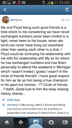 Me and Floyd being such good friends is a total shock to me considering we have never exchanged numbers, never been invited to a fight, never been to his house, never ate lunch, we never hung out anywhere other than seeing each other in a club…! Floyd could be confusing his relationship with me with his relationship with My ex for whom he has exchanged numbers and has flown personally to attend His weekend in Michigan which I wasn’t invited (guess I wasn’t int he circle of friends then) lol. I have great respect for him as far as him being a true champion in his sport but homies..? Circle of friends..? Nah.. Good luck to him tho keep making history champ…