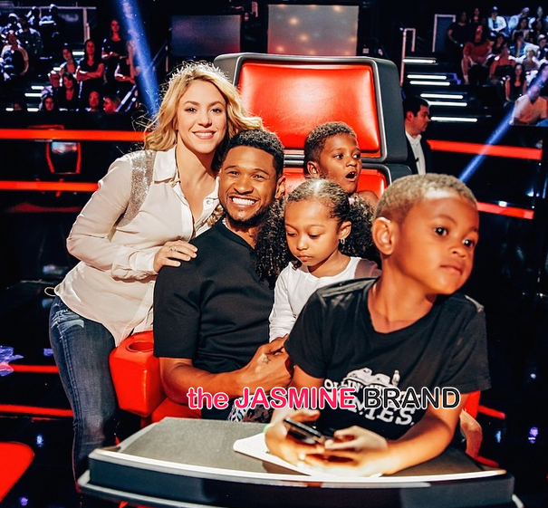 It’s take your kids to work day! Shakira and Usher Raymond pose on set with his sons and an adorable little girl. Cute!