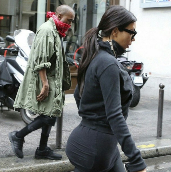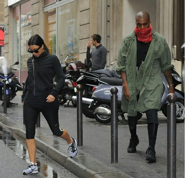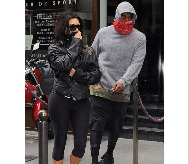 Yesterday, we caught ‘Ye attempting to go incognito by covering part of his face with a red hankerchief. Meanwhile, Kim showed off her curves in her usual black tights and black top. Reportedly, the three-day affair kicks off on Friday. In the meantime, check ’em out getting in shape for their big day!