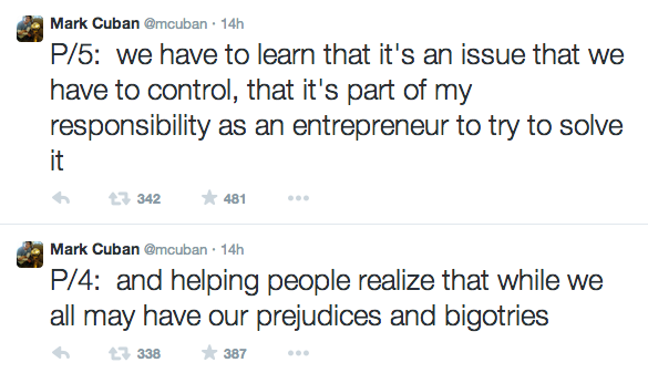 And so when I run into bigotry — in organizations I control — I try to find solutions. I’ll work with people. I’ll send them to training, I’ll send them to sensitivity training. I’ll try to give them a chance to improve themselves because I think helping people improve their lives, helping people engage with people they may fear or may not understand, and helping people realize that while we all have our prejudices and bigotries … We have to learn that it’s an issue that we have to control. It’s part of my responsibility as an entrepreneur to try to solve it, not just to kick the problem down the road.