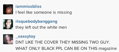 If the cover is suppose to represent the movie than essence should have included the other two men even if they are of another race. Not a good look essence!!!!!