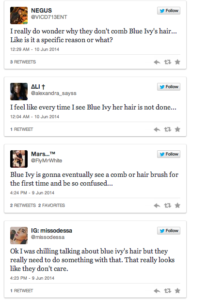 When the first pic was posted of Blue and her father this week, my first thought was- no they didn’t let her out the house in public like that!? But then I thought about Gabby- and this is NOT the same thing. Gabby was performing and people focused on the wrong thing. In this case, the child is not performing or has a job to do. Her very wealthy parents, and grandmother who is a hair stylist have allowed this to go on. The 3 ladies were talking about her parents, not the child. Nothing they said was wrong or out of order. Bey and Jay need to answer as to why they have a child who has unkempt hair. Same thing the Spice girl went through when she just shaved all her babies hair off bc she didn’t know what to do. The parents should be held accountable bc they would if they were everyday people who walked past you.