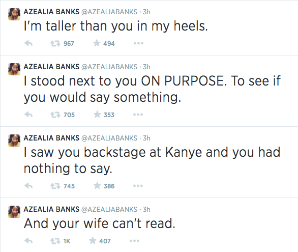 Rappers Azealia Banks and T.I. (Clifford Harris) have taken to both Instagram and Twitter calling each other all sorts of names. [Sidebar: These two haven’t gotten along for quite some time. They had another social media fight after Azealia suggested that T.I.’s protoge Iggy Azalea didn’t deserve a place on XXL’s “Freshmen Class” list.] From what we can tell, it began when Azealia made a comment about how unattractive Tiny, T.I.’s wife is. The comment stemmed from a new song called No Mediocre featuring T.I..