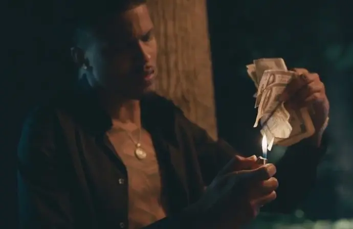 He expresses to his fans that he is shocked that he has became the big heart-throb singer that he is now while he burns money and wears a hat with the word death written on the front.