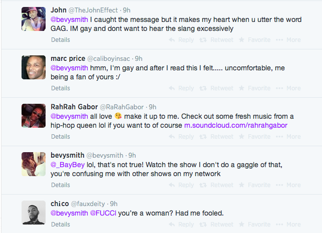 I watch Fashion Queens. I love that show. Wish it was on for an hour. I am a women and I don’t consider it an insult. Bevy does not use gay slang or whatever you want ot call it on the show and other than on the show I have no idea what she say like most of the people that are tweeting her. Like she said put that energy into something else positive!!