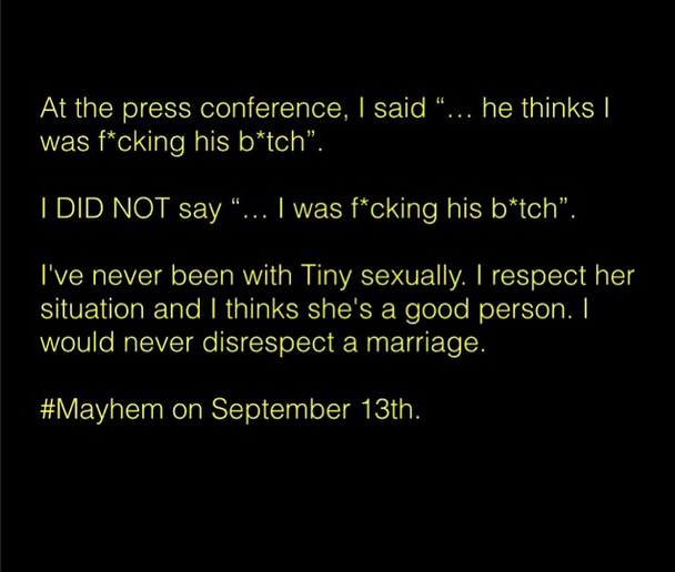At the press conference, I said “… he thinks I was f*cking his b*tch”. I DID NOT say “… I was f*cking his b*tch”. I’ve never been with Tiny sexually. I respect her situation and I thinks she’s a good person. I would never disrespect a marriage. #Mayhem on September 13th.