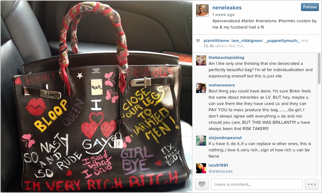 Last week, the Real Housewives of Atlanta cast mate posted the photo above, of her customized Birkin bag. As you’ll see, the uber expensive bag has some of NeNe’s famous catch phrases, like Close Your Legs to Married Men! This week, Wendy posted the question on Twitter –> Hot Question: What do think about @NeNeLeakes