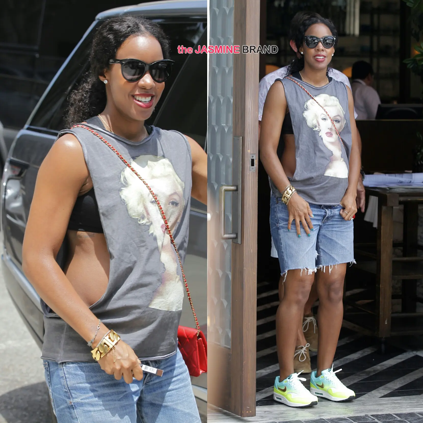 Kelly Rowland shops at M.A.C and lunches with her husband Tim Witherspoon in Beverly Hills. The expecting mom wore a marlin Marilyn Monroe printed Tee (with her sides exposed), comfy denim shorts and sneakers.