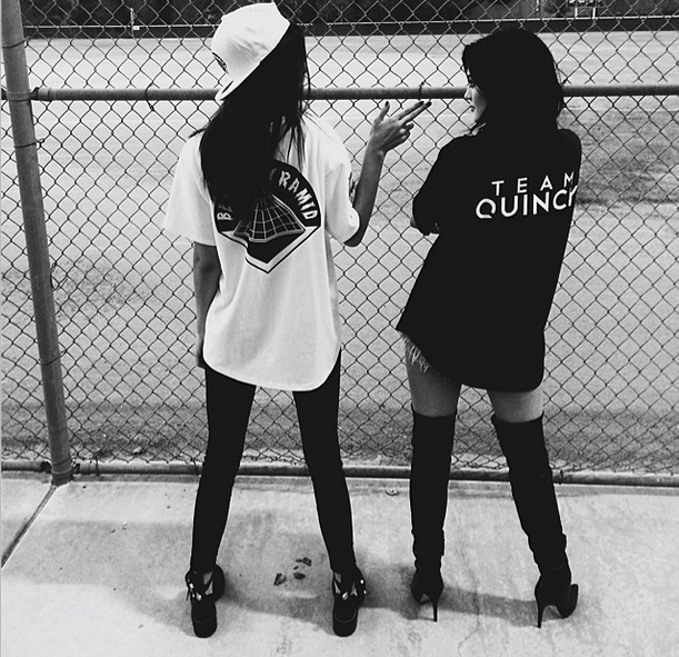 “Sibling Rivalry”! Kylie Jenner rocks a “Team Quincy” baseball jersey, cut off denim shorts paired with black thigh high suede Yves St Laurent Boots. While Kendall sports a “Black Pyramid” baseball jersey and matching hat with leggings.