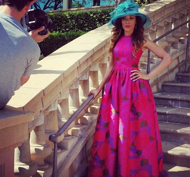 Michelle Williams hosts the “Preachers Of LA” special on Oxygen wearing a floor length Adrianna Papell gown and a classic vintage church hat.