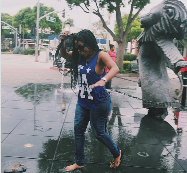 K. Michelle spotted having a little summer fun in Culver City,CA repping LA in a navy blue tank top and leopard Tory Burch flip flops.
