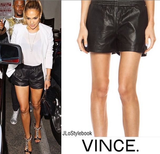 Jennifer Lopez rocks Vince shorts, Giuseppe Zanotti shoes and a Chanel bag.