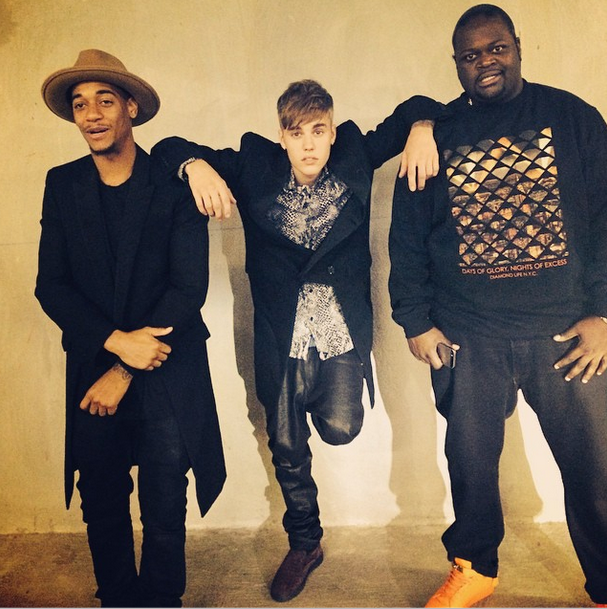 Justin Beiber hangs with his entourage rocking leather pants with a double breasted jacket.
