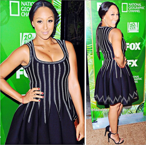 Tamera Mowry hits an Emmy Party in Hollywood, wearing a Azzedine Alaia dress and Stewart Weitzman shoes.