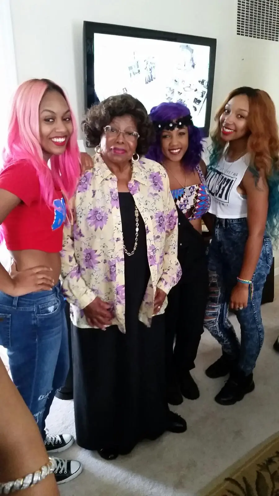 The OMG Girlz pose with Katherine Jackson and Michael Jackson’s children, Paris, Blanket and Prince, at the Michael Jackson Tribute Festival of the Arts 2014 this past weekend in Gary, Indiana.