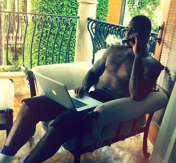 Carmelo Anthony puffs on a cigar, while on his Mac. He and wife Lala Anthony also attended Gabrielle Union and Dwyane Wade’s Miami wedding.