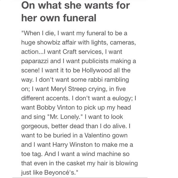 The funeral program included the excerpt from her book, I Hate Everyone … Starting With Me, in which she described the star-studded send-off she wanted as well as a page with three of Rivers’ classic lines: “Can we talk?” ”Who are you wearing?” and “Because I’m a funny person.”